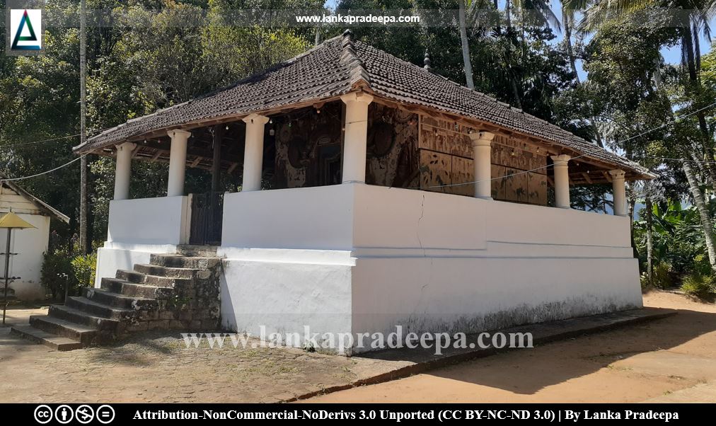 The present temple consists of a Stupa, an image house, a preaching hall, a Bodh-tree, and monk dwellings. Among them, the image house and the preaching hall are considered as archaeologically important monuments. The image house is thought to be a work belonging to the Kandyan Period (Wijesinghe, 2015). It has been built on an elevated platform and has two sections: the inner shrine and the outer ambulatory. The ambulatory is open but bound with a half-height wall.